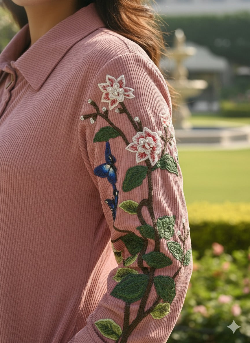 Crafted in a soft, textured rose, its defining feature is the breathtaking 3D floral and butterfly embroidery. An exquisite, limited piece.